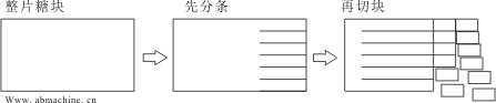 整片糖块放置于机器上,自动分条,并切块
