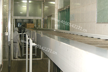 由滚筒输送机拼接而成,与包装机口连接,进料高速且输送量巨大,适合箱体运输;